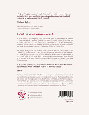 « Cette question vous agace, vous stresse ou vous rend euphorique quand l'idée « lumineuse » soudain jaillit, mais une chose est certaine : vous vous la posez tous les jours, ou presque. Et cette question, vous me la posez souvent… Alors pour vous aider au quotidien, j'ai eu envie de vous proposer 100 recettes variées à cuisiner au fil des saisons, à l'inspiration. À mes yeux, déguster un plat « maison » concocté avec de bons produits clôture la journée en beauté. C'est LE moment de détente par excellence.