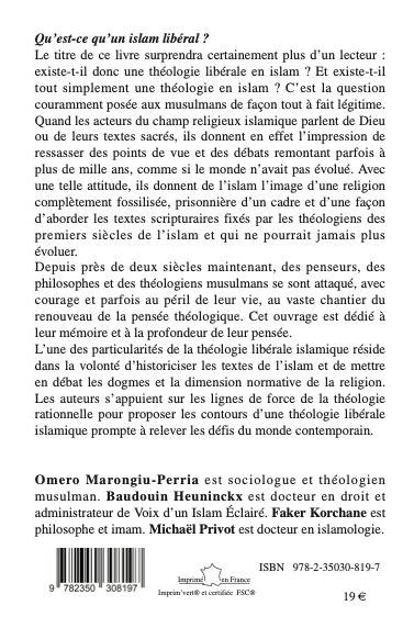 Cet ouvrage présente les grandes lignes d’une approche théologique musulmane libérale. Il expose les grands jalons d’une réflexion théologique qui met en débat aussi bien les notions de l’orthodoxie traditionnelle musulmane que celles liées à la modernité. Les contributeurs sont partisans de la démarche rationnelle du mu’tazilisme historique et de l’herméneutique des textes de l’islam puisant dans la démarche historico-critique. Tous se rejoignent pour proposer une lecture novatrice des textes de l’islam et des grands concepts théologiques pour réhabiliter les notions d’“autonomie” et de “responsabilité” du musulman afin qu’il poursuive en toute quiétude son cheminement intellectuel et spirituel.