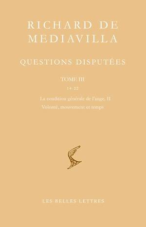 English summary: Richard of Middleton, a Franciscan living and working around the end of the 13th century, was a very important and profoundly original thinker. The Bibliotheque Scolastique series publishes, in 6 volumes, his unedited Quaestiones disputatae. Volume III deals with the questions concerning the free will of angels and humans. French description: Richard de Mediavilla, franciscain actif a la fin du XIIIe siecle, est un penseur scolastique fort important et profondement original. La Bibliotheque Scolastique publie en 6 tomes ses 45 questions disputees inedites (decennie 1290). Les tomes I, II et IV ont deja paru en 2011 et 2012. Ce volume est central, car, au terme d'une analyse serree, Mediavilla exalte particulierement la volonte de l'ange (et de l'homme), theme essentiel a l'identite de la theologie franciscaine, mais rarement theorise. L'orientation naturaliste et scientifique de sa demarche est encore plus nette, appuyee cette fois surtout sur Averroes. On verra, dans la question 16, que Mediavilla, bien avant Copernic, Kepler et Galilee, prouve la rotation terrestre autour du soleil et instaure un systeme d'attraction universelle. Il est le premier a revoir totalement la theorie du mouvement d'Aristote. Dans les questions 17 et 19, il elabore completement son fameux Principe Purement Possible et s'affirme comme un metaphysicien de premiere importance.
