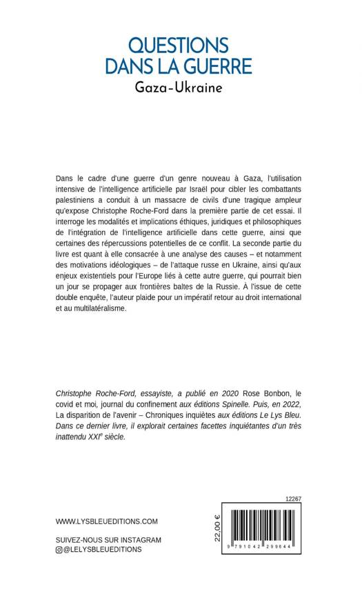 Dans le cadre d'une guerre d'un genre nouveau à Gaza, l'utilisation intensive de l'intelligence artificielle par Israël pour cibler les combattants palestiniens a conduit à un massacre de civils d'une tragique ampleur qu'expose Christophe Roche-Ford dans la première partie de cet essai. Il interroge les modalités et implications éthiques, juridiques et philosophiques de l'intégration de l'intelligence artificielle dans cette guerre, ainsi que certaines des répercussions potentielles de ce conflit. La seconde partie du livre est quant à elle consacrée à une analyse des causes - et notamment des motivations idéologiques - de l'attaque russe en Ukraine, ainsi qu'aux enjeux existentiels pour l'Europe liés à cette autre guerre, qui pourrait bien un jour se propager aux frontières baltes de la Russie. À l'issue de cette double enquête, l'auteur plaide pour un impératif retour au droit international et au multilatéralisme.