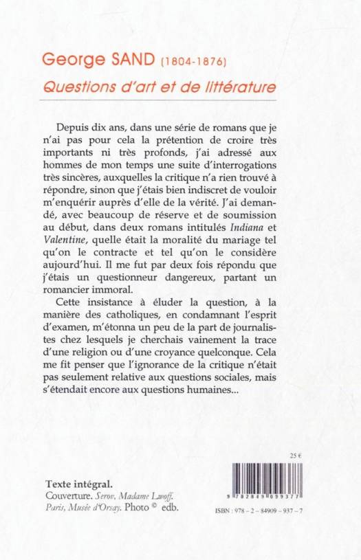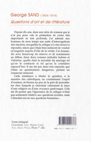 Depuis dix ans, dans une série de romans que je n'ai pas pour cela la prétention de croire très importants ni très profonds, j'ai adressé aux hommes de mon temps une suite d'interrogations très sincères, auxquelles la critique n'a rien trouvé à répondre, sinon que j'étais bien indiscret de vouloir m'enquérir auprès d'elle de la vérité. J'ai demandé, avec beaucoup de réserve et de soumission au début, dans deux romans intitulés Indiana et Valentine, quelle était la moralité du mariage tel qu'on le contracte et tel qu'on le considère aujourd'hui. Il me fut par deux fois répondu que j'étais un questionneur dangereux, partant un romancier immoral.