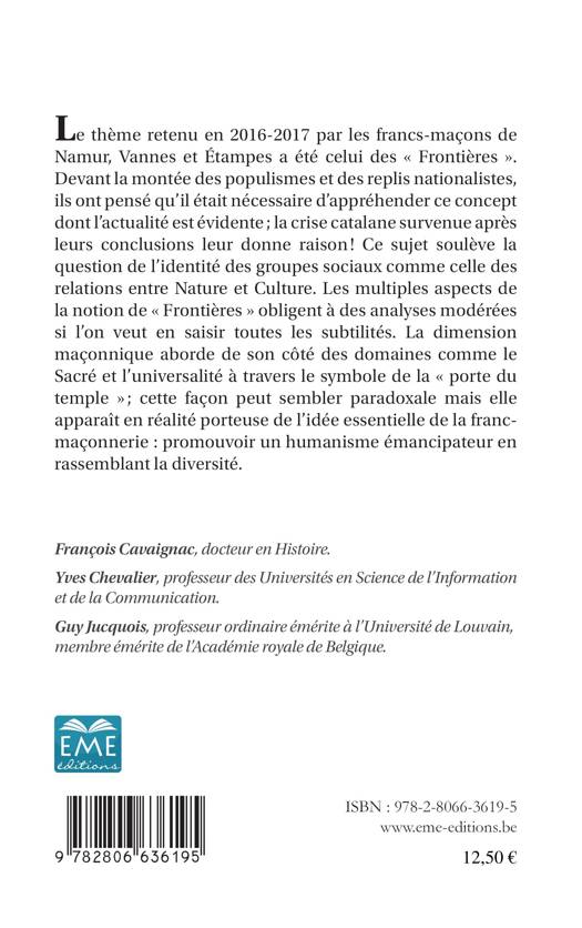 Pour la troisième année consécutive les trois loges de Namur (La Pierre blanche), Vannes (Conscience de l'Armor) et Étampes (L'Atelier écossais) poursuivent leurs réflexions contemporaines communes. L'actualité a quasiment imposé le thème des « Frontières » qui soulève des questions de toute nature, y compris maçonniques. Plus que jamais la devise : « Rassembler ce qui est épars » apparaît comme une voie de recherche, de culture et d'émancipation.