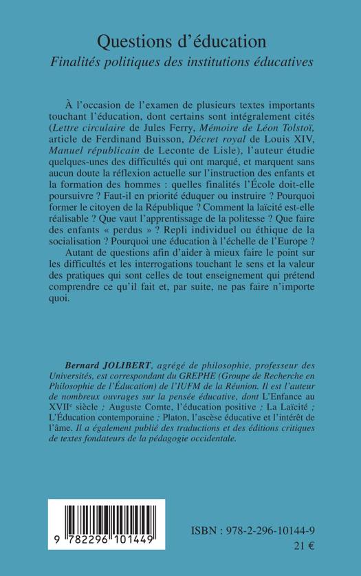 Quelles finalités l'Ecole doit-elle poursuivre ? Faut-il en priorité éduquer ou instruire ? Pourquoi former le citoyen de la République ? Comment la laïcité est-elle réalisable ? Que vaut l'apprentissage de la politesse ? Que faire des enfants "perdus" ? Autant de question étudiées par l'auteur, afin d'aider à mieux faire le point sur les difficultés et les interrogations touchant le sens et la valeur des pratiques qui sont celles de tout enseignement qui prétend comprendre ce qu'il fait, et, par suite, ne pas faire n'importe quoi.