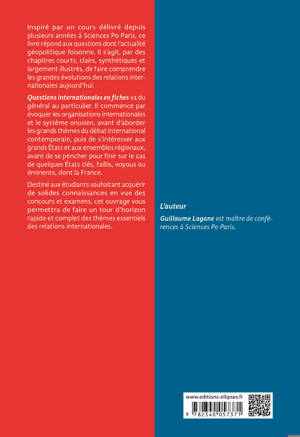 Destiné aux étudiants souhaitant acquérir de solides connaissances en vue des concours et examens, cet ouvrage permettra de faire un tour d’horizon rapide et complet des thèmes essentiels des relations internationales.