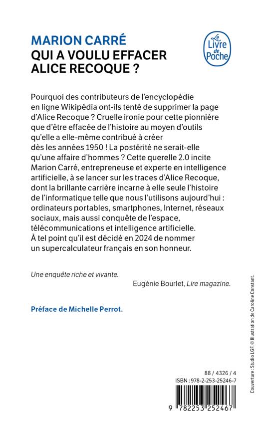 Cette querelle 2.0 incite Marion Carré, entrepreneuse et experte en intelligence artificielle, à se lancer sur les traces d’Alice Recoque, dont la brillante carrière incarne à elle seule l’histoire de l’informatique telle que nous l’utilisons aujourd’hui : ordinateurs portables, smartphones, internet, réseaux sociaux, mais aussi conquête de l’espace, télécommunications et intelligence artificielle. La postérité ne serait-elle qu’une affaire d’hommes ?