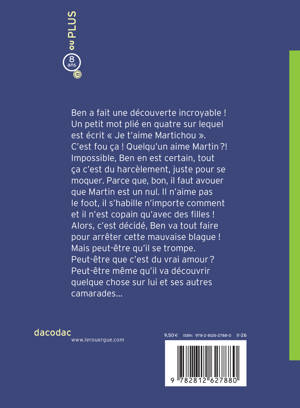 Ben a fait une découverte incroyable ! Un petit mot plié en quatre sur lequel est écrit « Je t'aime Martichou ». Impossible. Parce que, soyons francs, personne ne peut aimer Martin, il est trop différent des autres garçons. Ben est donc persuadé que quelqu'un se moque de Martin et lui a écrit ce mot pour l'embêter. Vu qu'il est référent harcèlement dans sa classe, il va tout faire pour y mettre un terme. Mais peut-être que Ben va faire une autre découverte, plus importante encore que de trouver l'auteur du mot, peut- être qu'il va découvrir quelque chose d'important sur lui et ses autres camarades...