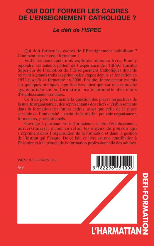 Qui doit former les cadres de l'Enseignement catholique ? Comment penser cette formation ? Les auteurs partent de l'expérience de l'Institut Supérieur de Promotion de l'Enseignement Catholique, mettant le projecteur sur des pratiques significatives ainsi que sur une approche systématisée de la formation professionnelle des chefs d'établissements scolaires. Cet ouvrage met en relief les enjeux de pouvoir qui s'expriment dans l'organisation de la formation et la gestion de l'institut qui l'assure.