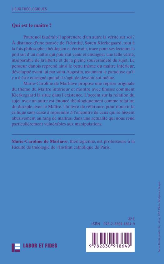 Pourquoi faudrait-il apprendre d’un autre la vérité sur soi? Une vérité qui ne serait pas un savoir prédéfini, mais la vérité du sujet dans le temps. À distance d’une pensée de l’identité, Søren Kierkegaard, tout à la fois philosophe, théologien et écrivain, trace pour ses lecteurs le portrait d’un maître qui pourrait venir et enseigner une telle vérité, inséparable de la liberté. Le penseur danois reprend ainsi le beau thème du maître intérieur, développé en son temps par saint Augustin, et le met en rapport dialectique avec la figure de Socrate, maître énigmatique. Que signifie être enseigné, apprendre, quand il s’agit de devenir soi-même? Et qui peut prétendre être un maître véritable? Marie-Caroline de Marliave propose une reprise originale du thème du maître intérieur et montre avec finesse comment Kierkegaard lui donne une portée existentielle. L’accent sur la relation du sujet avec un autre est énoncé théologiquement comme relation du disciple avec le maître. Il pourrait nourrir la critique sans cesse à reprendre à l’encontre de ceux qui prétendraient être des maîtres.
