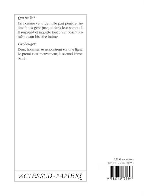 «Qui va là ?: » Un homme venu de nulle part pénètre l'intimité des gens jusque dans leur sommeil. Il surprend et inquiète tout en imposant lui-même son histoire intime.