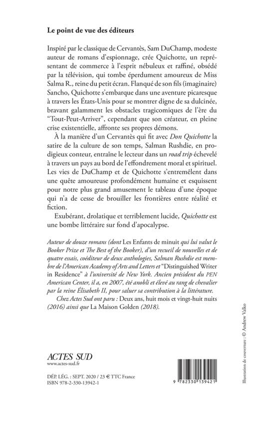 À la manière d'un Cervantès qui fit avec «Don Quichotte» la satire de la culture de son temps, Salman Rushdie, en prodigieux conteur, entraîne le lecteur dans un «road trip» échevelé à travers un pays au bord de l'effondrement moral et spirituel. Les vies de DuChamp et de Quichotte s'entremêlent dans une quête amoureuse profondément humaine et esquissent pour notre plus grand amusement le tableau d'une époque qui n'a de cesse de brouiller les frontières entre réalité et fiction.