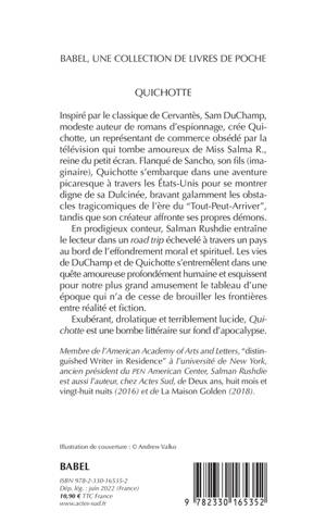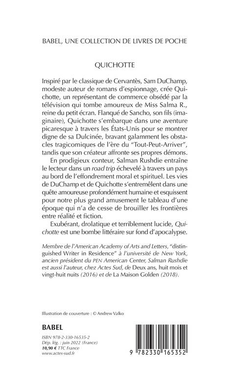Inspiré par le classique de Cervantès, Sam DuChamp, modeste auteur de romans d'espionnage, crée Quichotte, un représentant de commerce obsédé par la télévision qui tombe amoureux de Miss Salma R., reine du petit écran. Flanqué de Sancho, son fils (imaginaire), Quichotte s'embarque dans une aventure picaresque à travers les États-Unis pour se montrer digne de sa Dulcinée, bravant galamment les obstacles tragicomiques de l'ère du "Tout-Peut-Arriver", tandis que son créateur affronte ses propres démons. En prodigieux conteur, Salman Rushdie entraîne le lecteur dans un road trip échevelé à travers un pays au bord de l'effondrement moral et spirituel. Les vies de DuChamp et de Quichotte s'entremêlent dans une quête amoureuse profondément humaine et esquissent pour notre plus grand amusement le tableau d'une époque qui n'a de cesse de brouiller les frontières entre réalité et fiction. Exubérant, drolatique et terriblement lucide, "Quichotte" est une bombe littéraire sur fond d'apocalypse.
