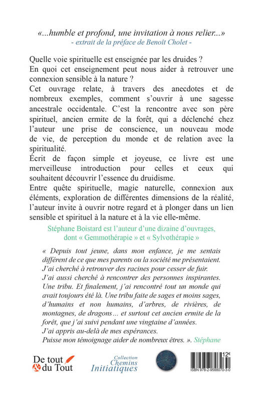 Quelle voie spirituelle est enseignée par les druides ? En quoi cet enseignement peut nous aider à retrouver une connexion sensible à la nature ? Cet ouvrage relate, à travers des anecdotes et de nombreux exemples, comment s’ouvrir à une sagesse ancestrale occidentale. C’est la rencontre avec son père spirituel, ancien ermite de la forêt, qui a déclenché chez l’auteur une prise de conscience, un nouveau mode de vie, de perception du monde et de relation avec la spiritualité. Écrit de façon simple et joyeuse, ce livre est une merveilleuse introduction pour celles et ceux qui souhaitent découvrir l’essence du druidisme. Entre quête spirituelle, magie naturelle, connexion aux éléments, exploration de différentes dimensions de la réalité, l’auteur invite à ouvrir notre regard et à plonger dans un lien sensible et spirituel à la nature et à la vie elle-même.