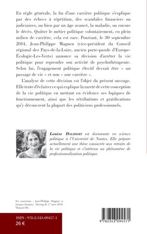 Il est très rare que les politiciens quittent le métier politique volontairement. Pourtant, le 30 septembre 2014, Jean-Philippe Magnen annonce sa décision d'arrêter la vie politique pour reprendre son activité de psychothérapeute. Selon lui, l'engagement politique électif devrait être « un passage de vie » et non « une carrière ». En analysant cette décision, cet ouvrage tente d'éclairer ce qui explique la rareté de cette conception de la vie politique en mettant en évidence ses logiques de fonctionnement ainsi que les rétributions et gratifications qu'y découvrent la plupart des politiciens professionnels.