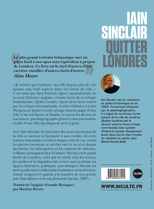« Je sentais que Londres, ma ville depuis plus de cinquante ans, était aspirée dans un vortex de vide. » C'est ainsi que Iain Sinclair, figure monumentale de la scène littéraire anglaise, résume la fin de sa trilogie londonienne, «Quitter Londres». Après deux livres salués par la critique internationale, «London» «Orbital» et «London Overground» (tous deux parus chez inculte, puis réédités en poche chez Babel/Actes Sud), «Quitter Londres» plonge dans la magie d'une ville et de son fleuve, la Tamise, à travers les dérives de son auteur, psychogéographe génial et documentaliste érudit d'une ville qui disparaît petit à petit. Avec Iain Sinclair, les fantômes des murs ancestraux de la ville se mettent à chuchoter à nos oreilles, des rencontres inattendues se font à chaque coin de rue, toutes les pierres racontent ce qu'elles ont vu ou vécu depuis des siècles, les hélicoptères et les caméras de vidéosurveillance témoignent face à l'auteur. Sinclair est le grand barde de Londres, celui qui en révèle tous les secrets, les mythes et les légendes, fait revivre sous sa plume ses figures littéraires, politiques, anecdotiques. Sinclair est notre guide dans ce labyrinthe londonien, vertical et horizontal, temporel et spatial, à la manière de son très proche ami Alan Moore et son «Jérusalem» (inculte, 2017).