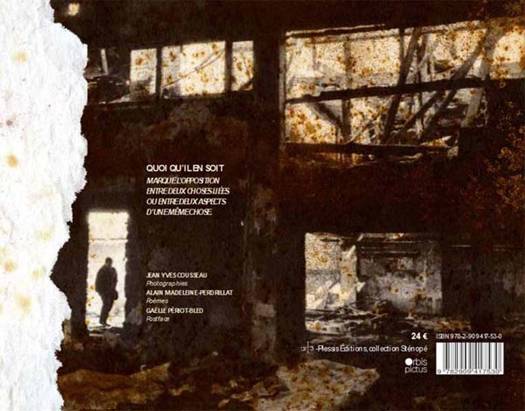 : Quoi qu‘il en soit marque l’opposition entre deux choses liées ou entre deux aspects d’une même chose<br /> Quoi qu’il en soit du refoulement, le désir laisse des traces. Elles peuvent être tardives, comme cette toile de son père que Jean Yves Cousseau a choisie pour boucler une série photographique consacrée au fatum. Dans l’aveu d’un désir de peinture longtemps tu, cette toile esquisse « un autoportrait en paysage ». Autoportrait de celui qui s’efface, de ce père qui n’est plus et qui s’était saisi pour lui-même dans l’effacement. Mais portrait du fils aussi qui a choisi d’être photographe, à savoir : celui qui rend visible tout en restant caché. Sans être effacé, Jean Yves Cousseau n’est jamais là qu’en creux dans ses photographies...<br /> La naissance de Quoi qu’il en soit s’arrime au même punctum de la disparition qui est aussi rencontre de deux projets parallèles. L’un porte sur ce père, ouvrier cheminot qui a osé la peinture à la fin de sa vie. À son départ à la retraite, il avait demandé un appareil photographique pour l’offrir à son fils dont il avait toujours soutenu la vocation, de l’entrée aux Beaux-Arts aux vernissages d’exposition qu’il ne manquait jamais. À sa mort, Jean Yves Cousseau avait découvert sa peinture, et notamment cet autoportrait de l’addendum réalisé à partir d’une photographie aujourd’hui disparue. <br /> L’autre projet semble sans lien avec le premier : né de Petite épopée urbaine, livre d’artiste créé en 2013, il rassemble des photographies que Jean Yves Cousseau a placées en séries pour établir, comme par métonymie, une relation du tout de l’image à sa partie. Plus récemment, disposant ces images côte à côte, les travaillant par déchirures, est apparue la récurrence de silhouettes d’hommes qui ne sont pas celles de son père, mais qui réactivent le souvenir de la photographie perdue, modèle de l’autoportrait peint. Comme l’écrit Alain Madeleine-Perdrillat dans son poème, « celui qui marche de dos » porte un nom sans visage. C’est alors que les deux projets ont fusionné en un livre palindrome : du point d’arrivée au point de départ, et réciproquement. Ce point trouve une autre définition dans La Chambre claire, lorsque Barthes définit le punctum : Car punctum, c’est aussi : piqûre, petit trou, petite tache, petite coupure - et aussi coup de dés. Le punctum d’une photo, c’est ce hasard qui, en elle, me point (mais aussi me meurtrit, me poigne)<br /> Les photographies de Jean Yves Cousseau connaissent la piqûre : celle du temps qui parsème arbitrairement les gris de ses pointes sépia. À certains endroits, les petites taches s’intègrent au récit de l’image photographique : elles viennent ici nourrir des pigeons, là dessiner des allées de graviers. À d’autres, le mouchetage est tel qu’il recouvre l’image et lui ajoute une seconde vie : celle organique des cellules qu’un microscope aurait grandies, celle d’un ocre mycélium qui aurait gagné la partie. Ne croyons pas qu’elles ne soient que le fruit du hasard : Jean Yves Cousseau les travaille en leur imposant la géométrie des formes élémentaires : on discerne parfois le triangle et le cercle.