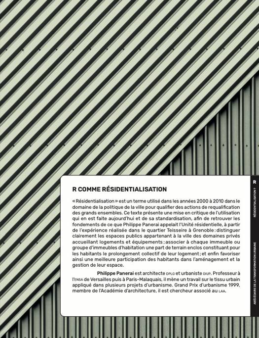 « Résidentialisation » est un terme utilisé dans les années 2000 à 2010 dans le domaine de la politique de la ville pour qualifier des actions de requalification des grands ensembles. Ce texte présente une mise en critique de l’utilisation qui en est faite aujourd’hui et de sa standardisation, afin de retrouver les fondements de ce que Philippe Panerai appelait l’Unité résidentielle, à partir de l’expérience réalisée dans le quartier Teisseire à Grenoble : distinguer clairement les espaces publics appartenant à la ville des domaines privés accueillant logements et équipements ; associer à chaque immeuble ou groupe d’immeubles d’habitation une part de terrain enclos constituant pour les habitants le prolongement collectif de leur logement ; et enfin favoriser ainsi une meilleure participation des habitants dans l’aménagement et la gestion de leur espace.