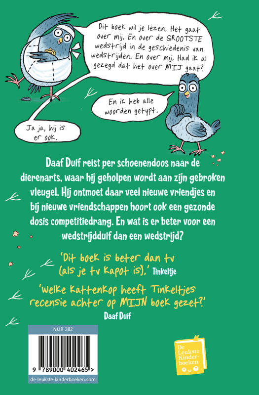 Daaf Duif reist per schoenendoos naar een dierenarts, waar hij hopelijk geholpen wordt met zijn gebroken vleugel. De dierenwinkel is vol nieuwe vriendjes en met nieuwe vriendschappen komt er ook een gezonde dosis competitiedrang, en wat is er beter voor een racingduif dan een race?