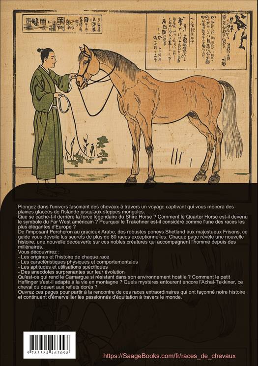 Plongez dans l'univers fascinant des races de chevaux avec ce guide détaillé qui présente plus de 80 races exceptionnelles du monde entier.Ce livre sur les chevaux offre une exploration approfondie des différentes races, organisée en sections géographiques distinctes :- Les races européennes, incluant les prestigieux chevaux allemands comme le Holsteiner et le Trakehner, les robustes chevaux britanniques comme le Shire Horse, et les élégantes races françaises comme le Percheron et le Camargue- Les races américaines, présentant les célèbres Quarter Horse et Appaloosa d'Amérique du Nord, ainsi que les races sud-américaines comme le Criollo et le Paso Fino- Les races asiatiques, mettant en valeur le raffinement de l'Arabe pur-sang et la résistance du cheval mongol- Une section complète dédiée aux poneys, des robustes Shetland aux polyvalents Welsh PoniesChaque race est présentée avec :- Ses caractéristiques physiques distinctives- Son histoire et ses origines- Ses aptitudes et utilisations principales- Ses traits de caractère- Ses besoins spécifiques en matière d'élevageQue vous soyez passionné d'équitation, éleveur, ou simplement curieux de découvrir la diversité des chevaux et poneys, ce livre sur les races de chevaux vous accompagnera dans votre découverte du monde équestre.Richement illustré de photographies en couleur, cet ouvrage constitue une référence pratique pour comprendre et apprécier les nombreuses races qui font la richesse du patrimoine équin mondial.Ce livre a été créé en utilisant des technologies innovantes telles que l'Intelligence Artificielle ainsi que des outils spécialement développés - par exemple, pour la recherche d'idées, la recherche d'informations, l'écriture, la relecture, l'assurance qualité et la conception d'illustrations décoratives.