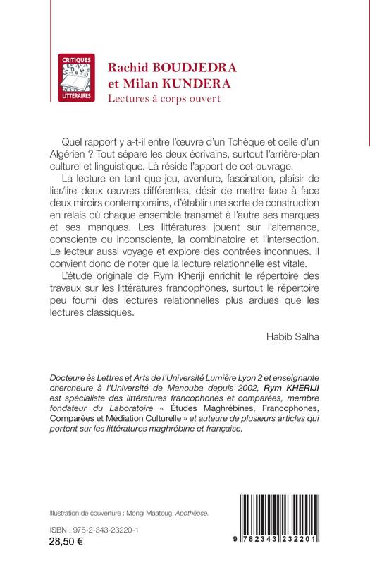 Quel rapport y a-t-il entre l'oeuvre d'un Tchèque et celle d'un Algérien ? Tout sépare les deux écrivains, surtout l'arrière-plan culturel et linguistique. Là réside l'apport de cet ouvrage. La lecture en tant que jeu, aventure, fascination, plaisir de lier/lire deux oeuvres différentes, désir de mettre face à face deux miroirs contemporains, d'établir une sorte de construction en relais où chaque ensemble transmet à l'autre ses marques et ses manques. Les littératures jouent sur l'alternance, consciente ou inconsciente, la combinatoire et l'intersection. Le lecteur aussi voyage et explore des contrées inconnues. Il convient donc de noter que la lecture relationnelle est vitale. L'étude originale de Rym Kheriji enrichit le répertoire des travaux sur les littératures francophones, surtout le répertoire peu fourni des lectures relationnelles plus ardues que les lectures classiques. Présentation de Habib Salha
