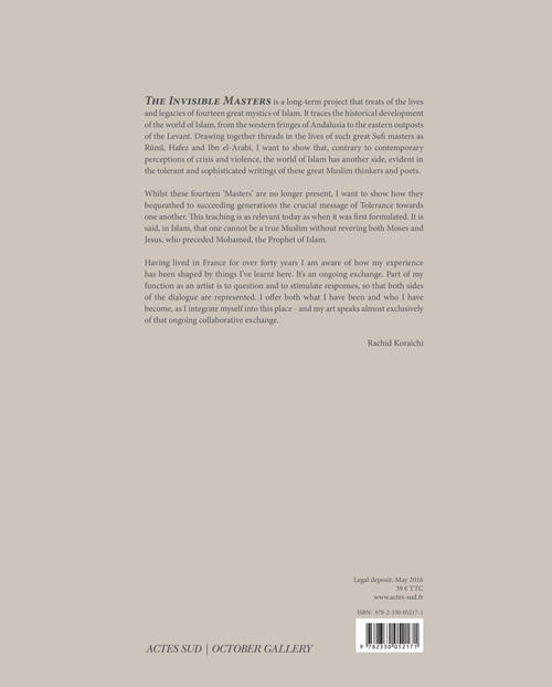 The current director of London's Tate Gallery, Chris Dercon, provides a eulogy of the work and retraces the complex history of the power relationships at work between the East and West, while Gerard Hougton, director of special projects at the October Gallery, tells us the back-story to the creation of the work in a previously unpublished interview with the artist. Ferrante Ferranti meanwhile relates the tale of his journey to transcendence. The final word belongs to Rachid Koraïchi who expresses his infinite respect of the Sufi masters.