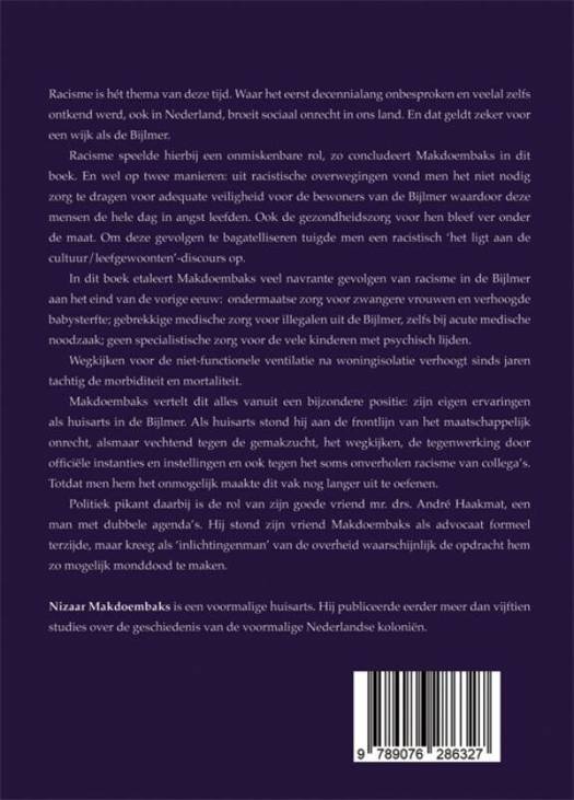 Racisme is hét thema van deze tijd. Waar het eerst decennialang onbesproken en veelal zelfs ontkend werd, ook in Nederland, broeit sociaal onrecht in ons land. En dat geldt zeker voor een wijk als de Bijlmer. Racisme speelde hierbij een onmiskenbare rol, zo concludeert Makdoembaks in dit boek. En wel op twee manieren: uit racistische overwegingen vond men het niet nodig zorg te dragen voor adequate veiligheid voor de bewoners van de Bijlmer waardoor deze mensen de hele dag in angst leefden. Ook de gezondheidszorg voor hen bleef ver onder de maat. Om deze gevolgen te bagatelliseren tuigde men een racistisch ‘het ligt aan de cultuur/leefgewoonten’-discours op. In dit boek etaleert Makdoembaks veel navrante gevolgen van racisme in de Bijlmer aan het eind van de vorige eeuw: ondermaatse zorg voor zwangere vrouwen en verhoogde babysterfte; gebrekkige medische zorg voor illegalen uit de Bijlmer, zelfs bij acute medische noodzaak; geen specialistische zorg voor de vele kinderen met psychisch lijden. Wegkijken voor de niet-functionele ventilatie na woningisolatie verhoogt sinds jaren tachtig de morbiditeit en mortaliteit. Makdoembaks vertelt dit alles vanuit een bijzondere positie: zijn eigen ervaringen als huisarts in de Bijlmer. Als huisarts stond hij aan de frontlijn van het maatschappelijk onrecht, alsmaar vechtend tegen de gemakzucht, het wegkijken, de tegenwerking door officiële instanties en instellingen en ook tegen het soms onverholen racisme van collega’s. Totdat men hem het onmogelijk maakte dit vak nog langer uit te oefenen. Politiek pikant daarbij is de rol van zijn goede vriend mr. drs. André Haakmat, een man met dubbele agenda’s. Hij stond zijn vriend Makdoembaks als advocaat formeel terzijde, maar kreeg als ‘inlichtingenman’ van de overheid waarschijnlijk de opdracht hem zo mogelijk monddood te maken.