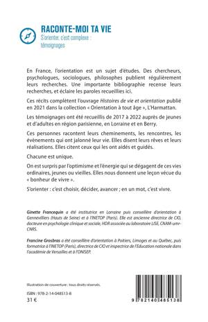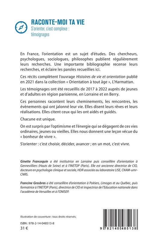 En France, l’orientation est un sujet d’études. Des chercheurs, psychologues, sociologues, philosophes publient régulièrement leurs recherches. Une importante bibliographie recense leurs recherches, et éclaire les paroles recueillies ici. Ces récits complètent l’ouvrage Histoires de vie et orientation publié en 2021 dans la collection « Orientation à tout âge », L’Harmattan. Les témoignages ont été recueillis de 2017 à 2022 auprès de jeunes et d’adultes en région parisienne, en Lorraine et en Berry. Ces personnes racontent leurs cheminements, les rencontres, les évènements qui ont jalonné leur vie. Elles disent leurs rêves et leurs réalisations. Elles citent ceux qui les ont aidés et guidés. Chacune est unique. On est surpris par l’optimisme et l’énergie qui se dégagent de ces vies ordinaires, jeunes ou vieilles. Elles nous donnent une leçon vécue du « bonheur de vivre ». S’orienter : c’est choisir, décider, avancer ; en un mot, c’est vivre.