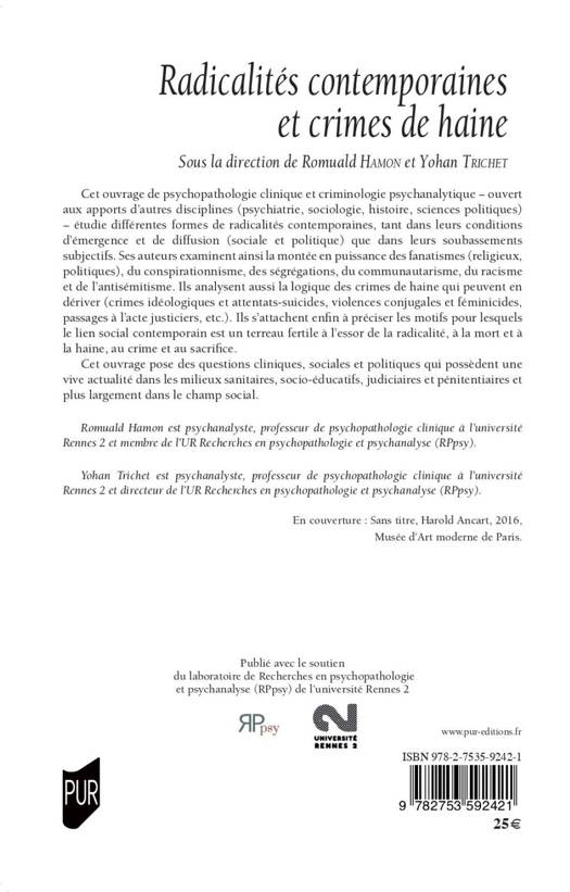 Cet ouvrage de psychopathologie clinique et criminologie psychanalytique − ouvert aux apports d’autres disciplines (psychiatrie, sociologie, histoire, sciences politiques) − étudie différentes formes de radicalités contemporaines, tant dans leurs conditions d’émergence et de diffusion (sociale et politique) que dans leurs soubassements subjectifs. Ses auteurs examinent ainsi la montée en puissance des fanatismes (religieux, politiques), du conspirationnisme, des ségrégations, du communautarisme, du racisme et de l’antisémitisme. Ils analysent aussi la logique des crimes de haine qui peuvent en dériver (crimes idéologiques et attentats-suicides, violences conjugales et féminicides, passages à l’acte justiciers, etc.). Ils s’attachent enfin à préciser les motifs pour lesquels le lien social contemporain est un terreau fertile à l’essor de la radicalité, à la mort et à la haine, au crime et au sacrifice.