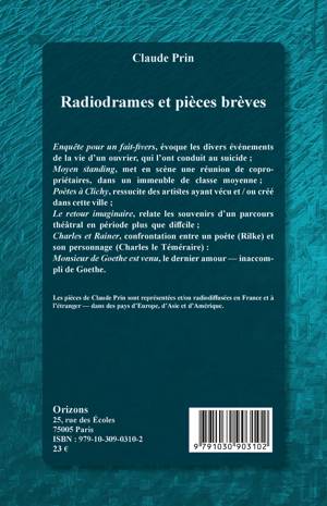 Enquête pour un fait-divers, évoque les divers événements de la vie d'un ouvrier, qui l'ont conduit au suicide ; Moyen standing, met en scène une réunion de copropriétaires, dans un immeuble de classe moyenne ; Poètes à Clichy, ressuscite des artistes ayant vécu et / ou créé dans cette ville ; Le retour imaginaire, relate les souvenirs d'un parcours théâtral en période plus que difficile ; Charles et Rainer, confrontation entre un poète (Rilke) et son personnage (Charles le Téméraire) ; Monsieur de Goethe est venu, le dernier amour - inaccompli - de Goethe.