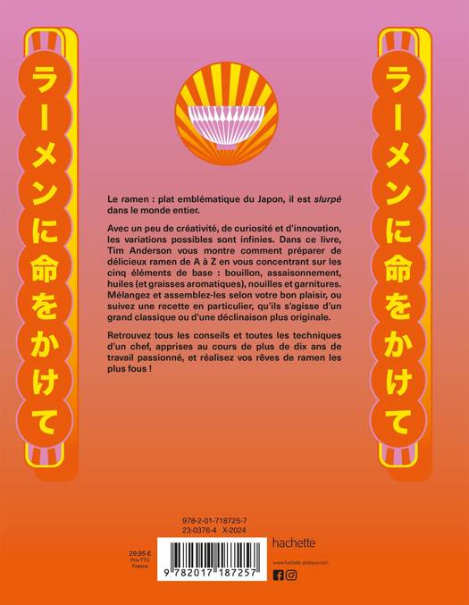 Avec un peu de créativité, de curiosité et d’innovation, les variations possibles sont infinies. Dans ce livre, Tim Anderson vous montre comment préparer de délicieux ramen de A à Z en vous concentrant sur les cinq éléments de base : bouillon, assaisonnement, huiles (et graisses aromatiques), nouilles et garnitures. Mélangez et assemblez-les selon votre bon plaisir, ou suivez une recette en particulier, qu’ils s’agisse d’un grand classique ou d’une déclinaison plus originale.