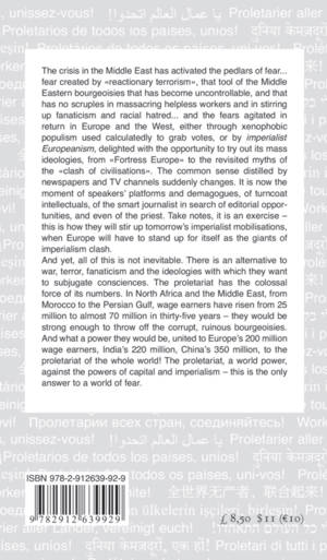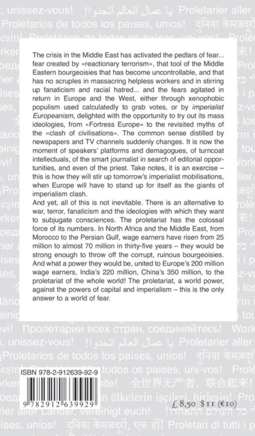 The crisis in the Middle East has activated the pedlars of fear... fear created by « reactionary terrorism », that tool of the Middle Eastern bourgeoisies that has come uncontrollable, and that has no scrupule in massacring helpless workers and in stirring up fanaticism and racial hatred... and the fears agitated in return in Europe and the West, either through xenophobic populism used calculatedly to grab votes, or by imperialist Europeanism, delighted with the opportunity to try out its mass ideologies, from « Fortress Europe » to the revisited myths of the « clash of civilization ». The common sense distilled by newspapers and TV channels suddenly changes. It is now the moment of speakers’platforms and demagogues, of turncoat intellectuals, of the smart journalist in search of editorial opportunities, and even of the priest. Take notes, it is an exercise – this is how they will stir up tomorrow’s imperialist mobilisations, when Europe will have to stand up for itself as the giants of imperialism clash. And yet, all of this is not inevitable. There is an alternative to war, terror, fanaticism and the ideologies with which they want to subjugate consciences. The proletariat has the colossal force of its numbres. In North Africa and the Middle East, from Morocco to the Persian Gulf, wage earners have risen from 25 million to almost 70 million in thirty-five years – they would be strong enough to throw off the corrupt, ruinous bourgeoisies. And what a power they could be, united to Europe’s 200 million wage earners, India’s 220 million, China’s 350 million, to the proletariat of the whole world ! The proletariat, a world power, against the powers of capital and imperialism – this is the only answer to a world of fear.
