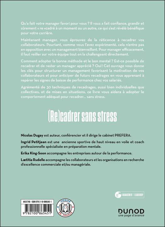 Qu’a fait votre manager favori pour vous ? Il vous a fait confiance, grandir et sûrement « re »cadré à un moment ou un autre, ce qui s’est révélé bénéfique pour votre carrière. Maintenant manager, vous éprouvez de la réticence à recadrer vos collaborateurs. Pourtant, comme vous l’avez expérimenté, cela n’entre pas en opposition avec un management bienveillant. Pour manager efficacement, il faut veiller sur votre équipe tout en la challengeant directement. Comment adopter la bonne méthode et le bon mental ? Est-ce possible de recadrer et de rester un manager apprécié ? Oui ! Cet ouvrage vous donne les clés pour structurer un management favorisant la motivation de vos collaborateurs et pour anticiper de futurs recadrages en vous apprenant à repérer les signes de baisse de performance chez vos salariés. Agrémenté de 30 techniques de recadrages, aussi bien individuelles que collectives, et de mises en situations, ce livre vous aidera à adopter le comportement adéquat pour recadrer… sans stress.