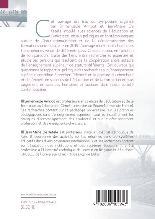 Cet ouvrage est issu du symposium intitulé « Les sciences de l'éducation et l'université : enjeux politiques et épistémologiques autour de l'internationalisation et de la démocratisation des formations universitaires » en 2019. L'ouvrage réunit neuf chercheurs francophones venus de différents pays et traite des liens entre recherche et expertise et étudie les tensions qui résultent de la coopération entre acteurs de l'enseignement supérieur de statuts différents.