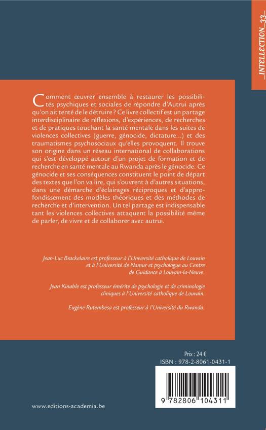 Comment oeuvrer ensemble à restaurer les possibilités psychiques et sociales de répondre d'Autrui après qu'on ait tenté de le détruire ? Ce livre collectif est un partage interdisciplinaire de réflexions, d'expériences, de recherches et de pratiques touchant la santé mentale dans les suites de violences collectives (guerre, génocide, dictature...) et des traumatismes psychosociaux qu'elles provoquent. Un tel partage est indispensable tant les violences collectives attaquent la possibilité même de parler, de vivre et de collaborer avec autrui.