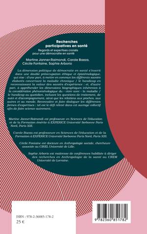 La dimension politique de démocratie en santé s’inscrit dans une double préoccupation éthique et épistémologique, qui vise : d’une part, à mettre en commun les différents savoirs élaborés concernant la maladie chronique / le handicap en reconnaissant la valeur des savoirs d’expérience ; et, d’autre part, à appréhender les dimensions biographiques inhérentes à la considération phénoménologique du « vivre avec » la maladie / le handicap au quotidien, incluant les questions de traitement, de suivi et d’accompagnement, ainsi que les relations aux proches, aux autres et au monde. Reconnaître et faire dialoguer les différentes formes d’expertises : tel est le défi relevé dans cet ouvrage collectif afin de faire science autrement.