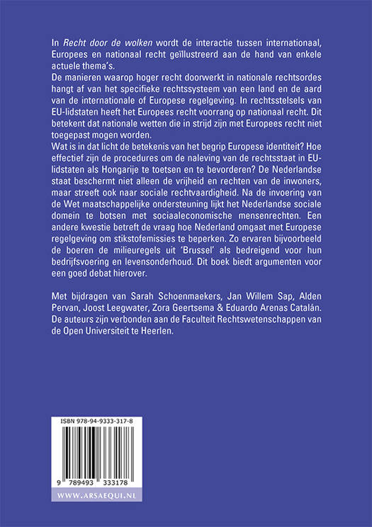 In Recht door de wolken wordt de interactie tussen internationaal, Europees en nationaal recht geïllustreerd aan de hand van enkele actuele thema’s. De manieren waarop hoger recht doorwerkt in nationale rechtsordes hangt af van het specifieke rechtssysteem van een land en de aard van de internationale of Europese regelgeving. In rechtsstelsels van EU-lidstaten heeft het Europees recht voorrang op nationaal recht. Dit betekent dat nationale wetten die in strijd zijn met Europees recht niet toegepast mogen worden. Wat is in dat licht de betekenis van het begrip Europese identiteit? Hoe effectief zijn de procedures om de naleving van de rechtsstaat in EU-lidstaten als Hongarije te toetsen en te bevorderen? De Nederlandse staat beschermt niet alleen de vrijheid en rechten van de inwoners, maar streeft ook naar sociale rechtvaardigheid. Na de invoering van de Wet maatschappelijke ondersteuning lijkt het Nederlandse sociale domein te botsen met sociaaleconomische mensenrechten. Een andere kwestie betreft de vraag hoe Nederland omgaat met Europese regelgeving om stikstofemissies te beperken. Zo ervaren bijvoorbeeld de boeren de milieuregels uit ‘Brussel’ als bedreigend voor hun bedrijfsvoering en levensonderhoud. Dit boek biedt argumenten voor een goed debat hierover.