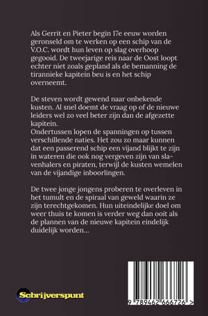Als Gerrit en Pieter begin 17e eeuw worden geronseld om te werken op een schip van de V.O.C. wordt hun leven op slag overhoop gegooid. De tweejarige reis naar de Oost loopt echter niet zoals gepland als de bemanning de tirannieke kapitein beu is en het schip overneemt. De steven wordt gewend naar onbekende kusten. Al snel doemt de vraag op of de nieuwe leiders wel zo veel beter zijn dan de afgezette kapitein. Ondertussen lopen de spanningen op tussen verschillende naties. Het zou zo maar kunnen dat een passerend schip een vijand blijkt te zijn in wateren die ook nog vergeven zijn van slavenhalers en piraten, terwijl de kusten wemelen van de vijandige inboorlingen. De twee jonge jongens proberen te overleven in het tumult en de spiraal van geweld waarin ze zijn terechtgekomen. Hun uiteindelijke doel om weer thuis te komen is verder weg dan ooit als de plannen van de nieuwe kapitein eindelijk duidelijk worden…