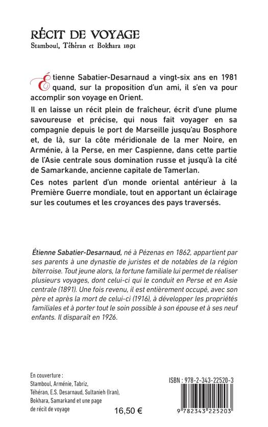 Étienne Sabatier-Desarnaud a vingt-six ans en 1891 quand, sur la proposition d’un ami, il s’en va pour accomplir son voyage en Orient. Il en laisse un récit plein de fraîcheur, écrit d'une plume savoureuse et précise, qui nous fait voyager en sa compagnie depuis le port de Marseille jusqu’au Bosphore et, de là, sur la côte méridionale de la mer Noire, en Arménie, à la Perse, en mer Caspienne, dans cette partie de l’Asie centrale sous domination russe et jusqu’à la cité de Samarkande, ancienne capitale de Tamerlan. Ces notes parlent d’un monde oriental antérieur à la Première Guerre mondiale, tout en apportant un éclairage sur les coutumes et les croyances des pays traversés.