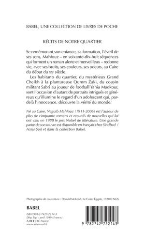 Se remémorant son enfance, sa formation, l'éveil de ses sens, Mahfouz - en soixante-dix-huit séquences qui forment un roman alerte et merveilleux - redonne vie, avec ses bruits, ses couleurs, ses odeurs, au Caire du début du XXe siècle.