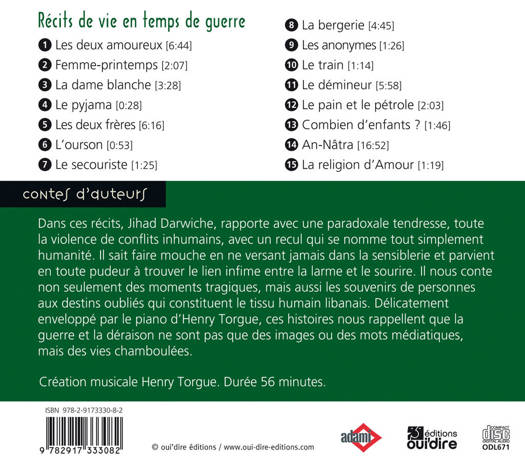 Dans ces récits, Jihad Darwiche, rapporte avec une paradoxale tendresse, toute la violence de conflits inhumains, avec un recul qui se nomme tout simplement humanité. Il sait faire mouche en ne versant jamais dans la sensiblerie et parvient en toute pudeur à trouver le lien infime entre la larme et le sourire. Il nous conte non seulement des moments tragiques, mais aussi les souvenirs de personnes aux destins oubliés qui constituent le tissu humain libanais. Délicatement enveloppé par le piano d'Henry Torgue, ces histoires nous rappellent que la guerre et la déraison ne sont pas que des images ou des mots médiatiques, mais des vies chamboulées.