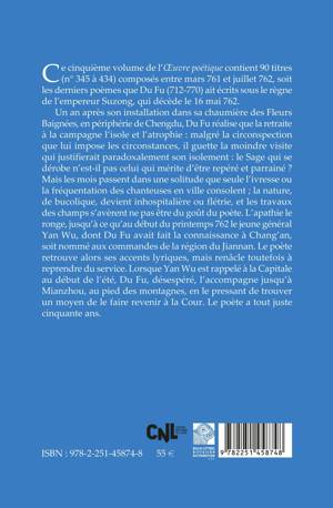 Ce cinquième volume de l’ Œuvre poétique contient 90 titres (n° 345 à 434) composés entre mars 761 et juillet 762, soit les derniers poèmes que Du Fu (712-770) ait écrits sous le règne de l’empereur Suzong, qui décède le 16 mai 762. Un an après son installation dans sa chaumière des Fleurs Baignées, en périphérie de Chengdu, Du Fu réalise que la retraite à la campagne l’isole et l’atrophie : malgré la circonspection que lui impose les circonstances, il guette la moindre visite qui justifierait paradoxalement son isolement : le Sage qui se dérobe n’est-il pas celui qui mérite d’être repéré et parrainé ? Mais les mois passent dans une solitude que seule l’ivresse ou la fréquentation des chanteuses en ville consolent ; la nature, de bucolique, devient inhospitalière ou flétrie, et les travaux des champs s’avèrent ne pas être du goût du poète. L’apathie le ronge, jusqu’à ce qu’au début du printemps 762 le jeune général Yan Wu, dont Du Fu avait fait la connaissance à Chang’an, soit nommé aux commandes de la région du Jiannan. Le poète retrouve alors ses accents lyriques, mais renâcle toutefois à reprendre du service. Lorsque Yan Wu est rappelé à la Capitale au début de l’été, Du Fu, désespéré, l’accompagne jusqu’à Mianzhou, au pied des montagnes, en le pressant de trouver un moyen de le faire revenir à la Cour. Le poète a tout juste cinquante ans.
