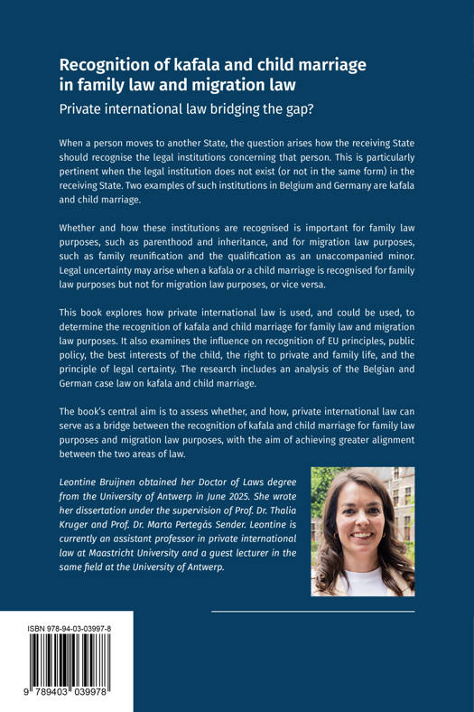 Recognition of kafala and child marriage in family law and migration law: private international law bridging the gap? explores how private international law is used, and could be used, to determine the recognition of kafala and child marriage for family law and migration law purposes. It also examines the influence on recognition of EU principles, public policy, the best interests of the child, the right to private and family life, and the principle of legal certainty. The research includes an analysis of the Belgian and German case law on kafala and child marriage.