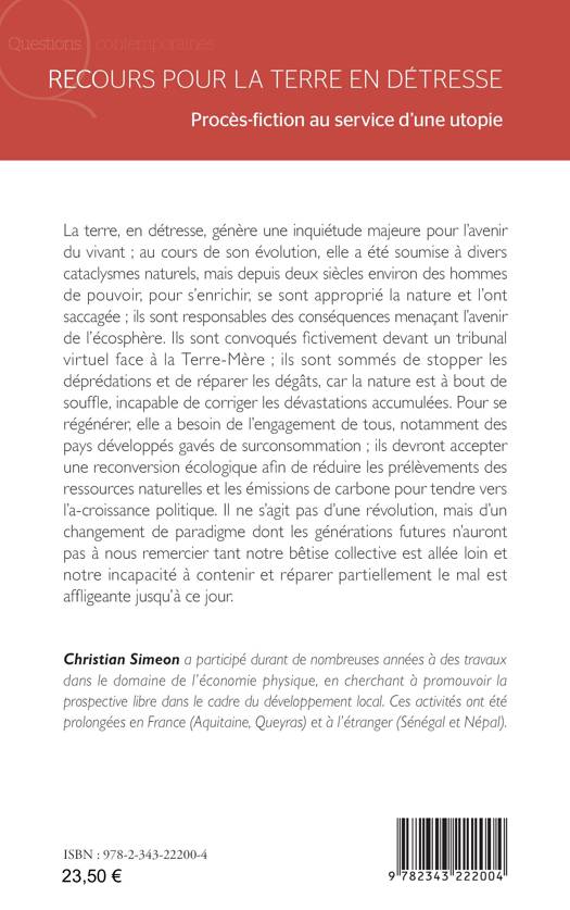 La terre, en détresse, génère une inquiétude majeure pour l'avenir du vivant; au cours de son évolution, elle a été soumise à divers cataclysmes naturels, mais depuis deux siècles environ des hommes de pouvoir, pour s'enrichir, se sont approprié la nature et l'ont saccagée; ils sont responsables des conséquences menaçant l'écosphère. Ils sont convoqués activement devant un tribunal virtuel face à la Terre-Mère; ils sont sommés de stopper les déprédations et de réparer les dégâts, car la nature est à bout de souffle. Pour se régénérer, elle a besoin de l'engagement de tous, notamment des pays développés gavés de surconsommation; ils devront accepter une reconversion écologique afin de réduire les prélèvements des ressources naturelles et les émissions de carbone pour tendre vers l'a-croissance politique. Il ne s'agit pas d'une révolution, mais d'un changement de paradigme.