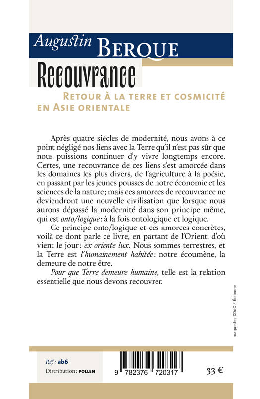 Ce principe onto/logique et ces amorces concrètes, voilà ce dont parle ce livre, en partant de l'Orient, d'où vient le jour : ex oriente lux. Nous sommes terrestres, et la Terre est l'humainement habitée : notre écoumène, la demeure de notre être.