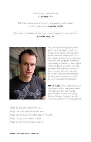 Op zijn vierentwintigste stort het leven van Matt Haig volledig in. Hij ziet geen enkele uitweg, geen reden meer om te bestaan. Dit is het verhaal van hoe hij zijn depressie overwon, een ziekte die hem bijna vernietigde, en hoe hij opnieuw leerde met volle teugen van het leven te genieten. Redenen om te blijven leven is meer dan een memoire: het is een ontroerende, grappige en vreugdevolle zoektocht naar hoe om te gaan met depressie.