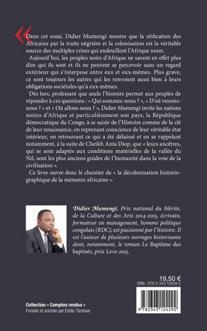 L'auteur montre que la réification des Africains par la traite négrière et la colonisation est la véritable source des multiples crises qui endeuillent l'Afrique noire. Professant que seule l'histoire permet aux peuples de répondre aux questions "Qui sommes-nous ?", "Doù venons-nous ?" et "Où allons-nous ?", l'auteur invite les nations noires d'Afrique et particulièrement son pays, la RDC, à se saisir de l'histoire comme de la clé de leur renaissance, en reprenant conscience de leur véritable état intérieur. Ce livre ouvre donc le chantier de "la décolonisation historiographique de la mémoire africaine".