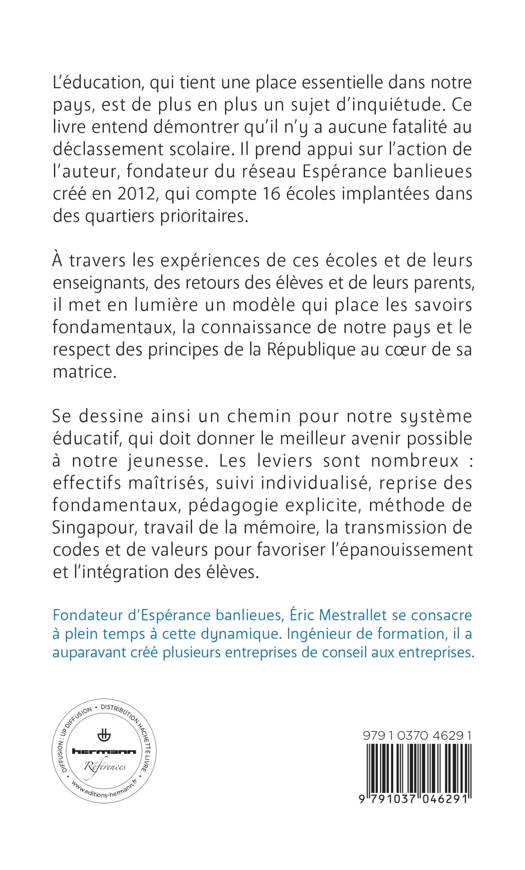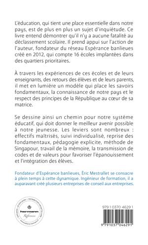 L’éducation, qui tient une place essentielle dans notre pays, est de plus en plus un sujet d’inquiétude. Ce livre entend démontrer qu’il n’y a aucune fatalité au déclassement scolaire. Il prend appui sur l’action de l’auteur, fondateur du réseau Espérance banlieues créé en 2012, qui compte 16 écoles implantées dans des quartiers prioritaires.