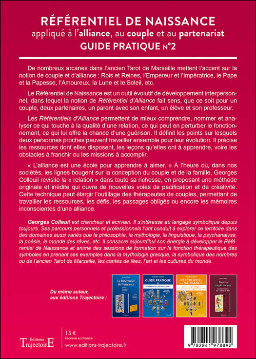 De nombreux arcanes dans l’ancien Tarot de Marseille mettent l’accent sur la notion de couple et d’alliance. Le Référentiel de Naissance est un outil évolutif de développement interpersonnel, dans lequel la notion de Référentiel d’Alliance fait sens, que ce soit pour un couple, deux partenaires, un parent avec son enfant, etc. Les Référentiels d’Alliance permettent de mieux comprendre, nommer et analyser ce qui touche à la qualité d’une relation, ce qui peut en perturber le fonctionnement, ce qui lui offre la chance d’une guérison. « L’alliance est une école pour apprendre à aimer. » À l’heure où, dans nos sociétés, les lignes bougent sur la conception du couple et de la famille, Georges Colleuil revisite la « relation » dans toute sa richesse, en proposant une méthode originale et inédite qui ouvre de nouvelles voies de pacification et de créativité. Cette technique peut élargir l’outillage des thérapeutes de couples, permettant de travailler les ressources, les défis, les passages obligés ou encore les mémoires inconscientes d’une alliance.