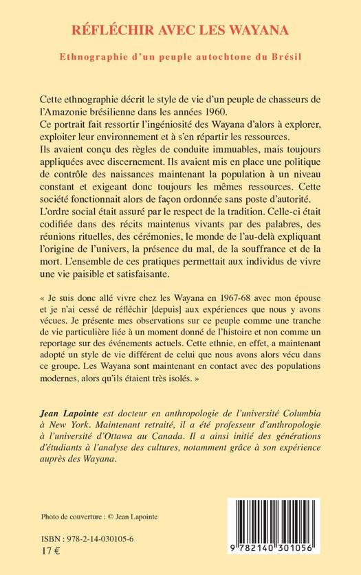 Cette ethnographie décrit le style de vie d'un peuple de chasseurs de l'Amazonie brésilienne dans les années 1960. Ce portrait fait ressortir l'ingéniosité des Wayana d'alors à explorer, exploiter leur environnement et à s'en répartir les ressources. Ils avaient conçu des règles de conduite immuables, mais toujours appliquées avec discernement. Ils avaient mis en place une politique de contrôle des naissances maintenant la population à un niveau constant et exigeant donc toujours les mêmes ressources. Cette société fonctionnait alors de façon ordonnée sans poste d'autorité. L'ordre social était assuré par le respect de la tradition. Celle-ci était codifiée dans des récits maintenus vivants par des palabres, des réunions rituelles, des cérémonies, le monde de l'au-delà expliquant l'origine de l'univers, la présence du mal, de la souffrance et de la mort. L'ensemble de ces pratiques permettait aux individus de vivre une vie paisible et satisfaisante