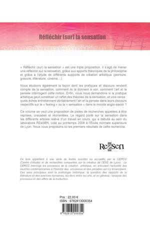 « Réfléchir (sur) la sensation » est une triple proposition. Il s’agit de mener une réflexion sur la sensation, grâce aux apports théoriques de la philosophie et grâce à l’étude de différents supports de création artistique (peinture, gravure, littérature, cinéma…). Nous étudions également la façon dont les pratiques et discours rendent compte de la sensation, comment ils l’interrogent et la donnent à voir, comment l’art et la pensée réfléchissent (à) cette notion. Enfin, nous nous demandons si la pratique artistique peut constituer un reflet des théories de la sensation, et vice-versa : quels échos entretiennent véritablement l’art et la pensée dans leurs discours respectifs sur le « feeling » ou la « sensation » dans le monde anglo-saxon ?§§Ce volume se veut une proposition de pistes de recherches appelées à être reprises, creusées et réorientées. Le regard porté sur la sensation dans les différents articles relève d’un travail en cours, qui a débuté au printemps 2 8, au sein du laboratoire REsSEN. Nous vous proposons ici les premiers résultats de cette recherche.