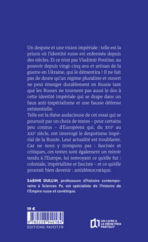 Un despote et une vision impériale : telle est la prison où l'identité russe est enfermée depuis des siècles. Et ce n'est pas Vladimir Poutine, au pouvoir depuis vingt-cinq ans et artisan de la guerre en Ukraine, qui le démentira ! Il ne fait pas de doute qu'un régime pluraliste et ouvert ne peut émerger durablement en Russie tant que les Russes ne tournent pas aussi le dos à cette identité impériale qui se drape dans un faux anti-impérialisme et une fausse défense existentielle. Telle est la thèse audacieuse de cet essai qui se poursuit par un choix de textes - pour certains peu connus - d'Européens qui, du XVIe au XXIe siècle, ont interrogé le despotisme impérial de la Russie. Leur actualité est troublante. Car ne nous y trompons pas : fascinés et critiques, ces textes sont également un miroir tendu à l'Europe, lui renvoyant ce qu'elle fut : coloniale, impérialiste et fasciste - et ce qu'elle pourrait bien devenir : antidémocratique.